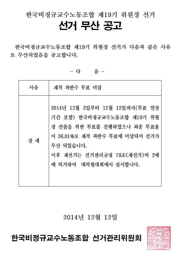 한국비정규교수노동조합 제19기 위원장 직접선거 무산 공고 페이지 정보 작성자 조선대분회 작성일14-12-15 00:12 조회462회 댓글0건 이전글 다음글 목록 본문 한국비정규교수노동조합 제19기 위원장 직접선거 무산 공고 댓글목록 등록된 댓글이 없습니다. 이전글 다음글 목록