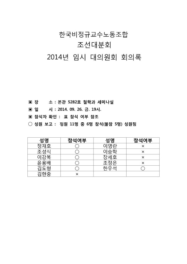 2014년 임시대의원회 회의록 공고 페이지 정보 작성자 조선대분회 작성일14-10-02 22:59 조회424회 댓글0건 이전글 다음글 목록 본문 2014년 9월 26일 진행 되었던 임시 대의원회 회의록을 공고합니다. 댓글목록 등록된 댓글이 없습니다. 이전글 다음글 목록