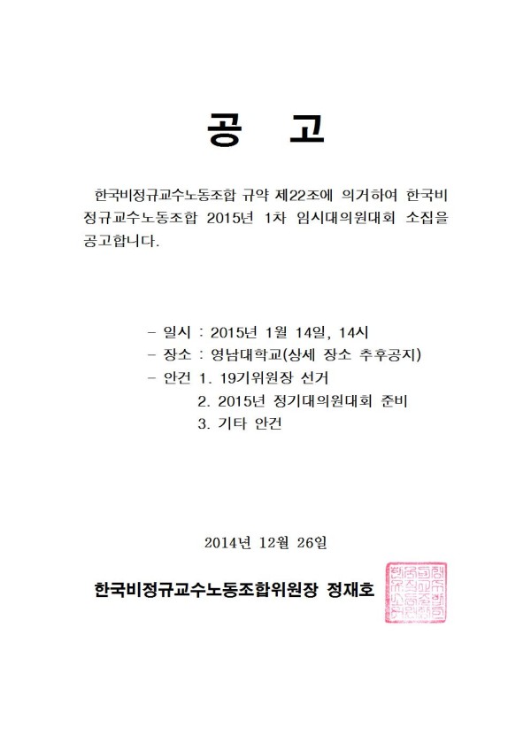 한국비정규교수노동조합 2015년 1차 임시 대의원대회 공고 페이지 정보 작성자 조선대분회 작성일14-12-26 00:48 조회495회 댓글0건 이전글 다음글 목록 본문 한국비정규교수노동조합 2015년 1차 임시 대의원대회 공고 댓글목록 등록된 댓글이 없습니다. 이전글 다음글 목록