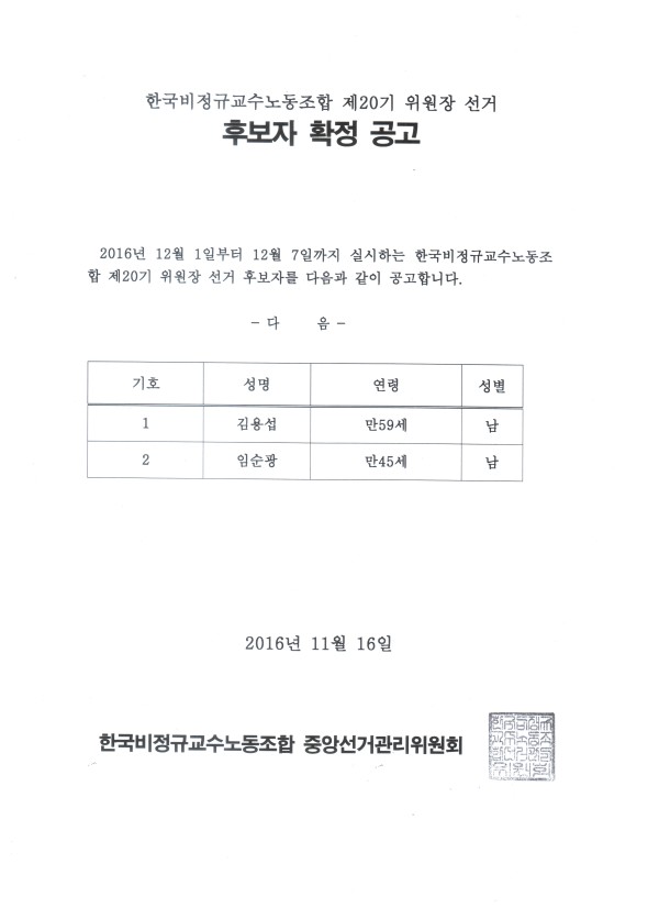 한국비정규교수노동조합 20기 위원장 선거 후보자 확정 공고 페이지 정보 작성자 조선대분회 작성일16-11-16 17:13 조회426회 댓글0건 이전글 다음글 목록 본문 한국비정규교수노동조합 20기 위원장 선거 후보자 확정 공고 댓글목록 등록된 댓글이 없습니다. 이전글 다음글 목록