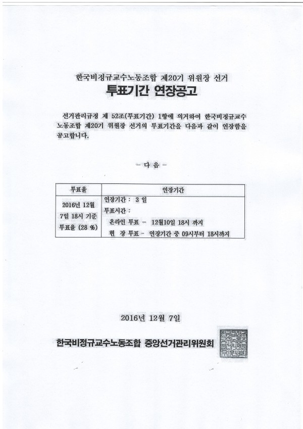 한국비정규교수노동조합 제20기 위원장 선거 투표기간 연장공고
