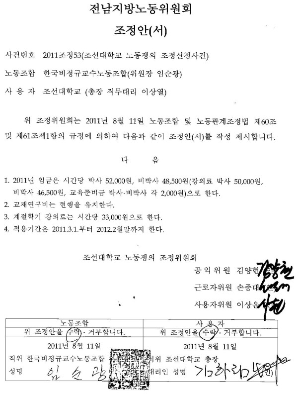 지노위에서 조정된 2011년 임금협상 결과를 보고 드립니다.