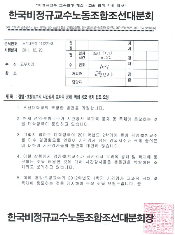 - 이에 본 조합은 대학측에 겸임 초빙교수가 2012학년도 1학기 시간강사 교과목 공채 및 특채에 응모하는 것을 금지하여 주실 것을 대학측에 요청하였습니다.