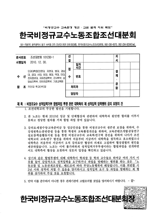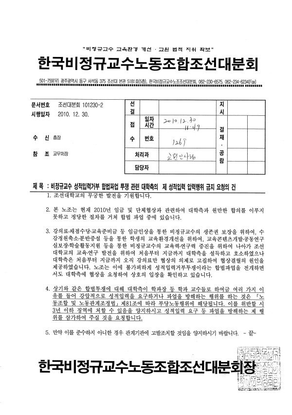 [공문]비정규교수 성적입력거부 합법파업 투쟁 관련 대학측의 제 성적입력 압력행위 금지 요청의 건