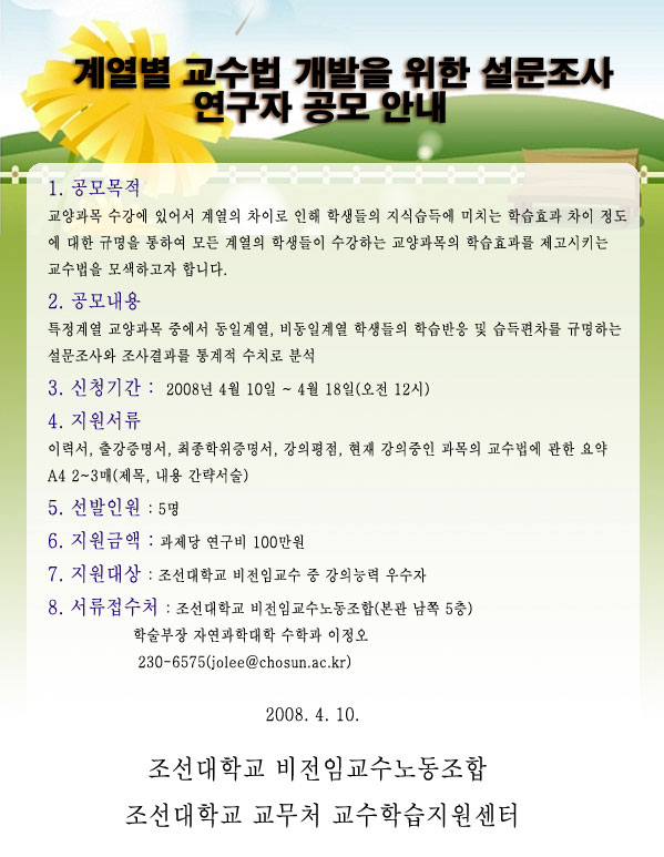 비전임교수교수법 개발 프로젝트 공모 페이지 정보 작성자 조선대분회 작성일08-04-21 01:08 조회1,145회 댓글0건 이전글 다음글 목록 본문 비전임교수교수법 개발 프로젝트 공모 댓글목록 등록된 댓글이 없습니다. 이전글 다음글 목록