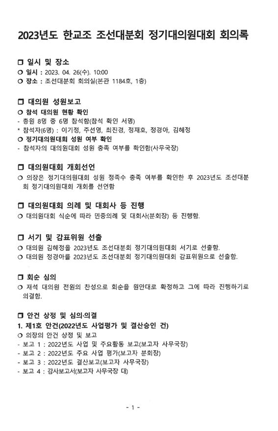2023년도 한교조 조선대분회 정기대의원대회 회의록 페이지 정보 작성자 조선대분회 작성일23-05-31 08:06 조회404회 댓글0건 이전글 다음글 목록 본문 2023년도 한교조 조선대분회 정기대의원대회 회의록 댓글목록 등록된 댓글이 없습니다. 이전글 다음글 목록
