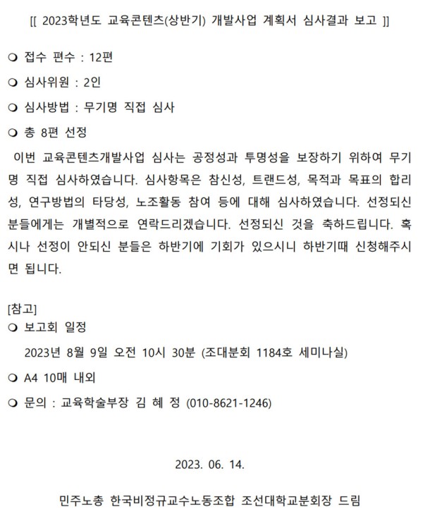 [[ 2023 교육콘텐츠(상반기) 개발사업 계획서 심사결과 보고 ]] 페이지 정보 작성자 조선대분회 작성일23-06-14 08:17 조회515회 댓글0건 이전글 다음글 목록 본문 ※ 일정은 상황에 따라 변경될 수 있습니다. 댓글목록 등록된 댓글이 없습니다. 이전글 다음글 목록