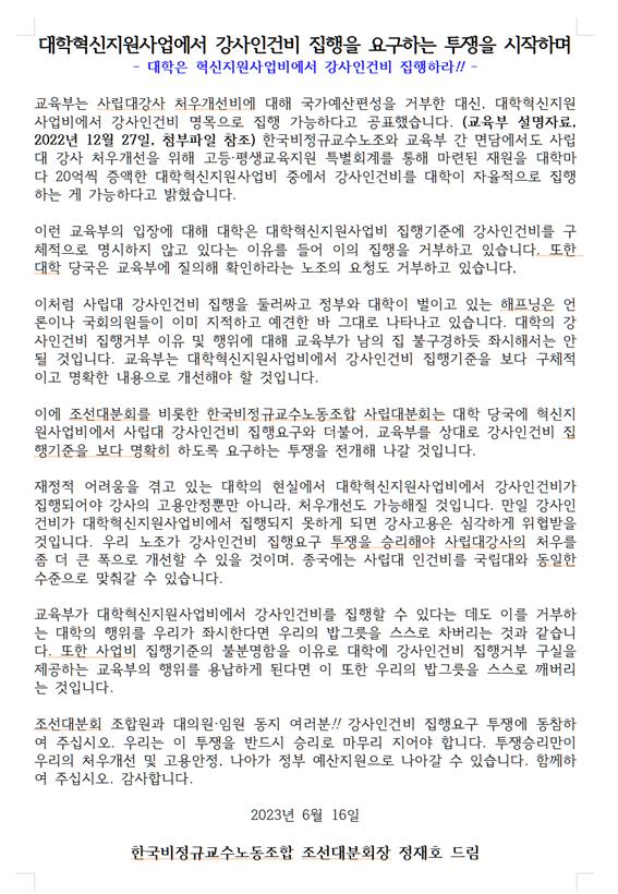 대학혁신지원사업에서 강사인건비 집행을 요구하는 투쟁을 시작하며