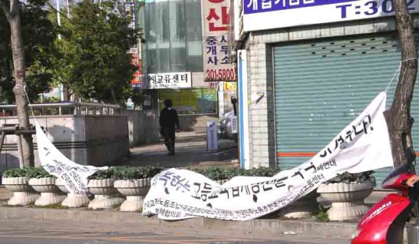 -28일 오후 3시 20분경 권철현위원장 지구당사 부근 4거리 각진 곳에 걸은 플래카드-교수노조 민교협 등에서 보낸 것-를 35세쯤 되는 회색 츄리닝 상의와 회색바지를 입은 나이는35세정도, 신장은 175센티미터쯤 되는 청년이 면도날도 찢었습니다.(사진 참조) 마침 그 아래서 대자보를 길바닥에 붙이고 있어 소리를 듣고 조합원 김영곤교수가 잡았지만 역부족이라 범인은 달아났습니다. 김동애특위장이 은행에 가서 김영곤교수 혼자 있었고 5분쯤 허리띠를 잡고 주민들에게 사람 살리라며 소리쳐 신고를 청하는 사이에 역부족으로 범인은 달아났습니다.
