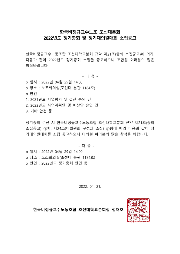 한국비정규교수노조 조선대분회 2022년도 정기총회 및 정기대의원대회 소집공고