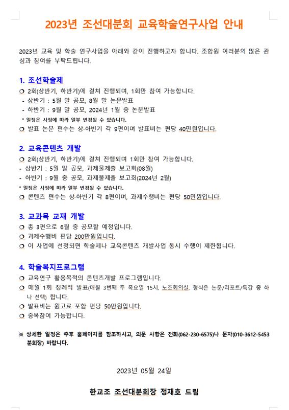 2023년 조선대분회 교육학술연구사업 안내 페이지 정보 작성자 조선대분회 작성일23-05-24 00:11 조회431회 댓글0건 이전글 다음글 목록 본문 2023년 조선대분회 교육학술연구사업 안내 댓글목록 등록된 댓글이 없습니다. 이전글 다음글 목록