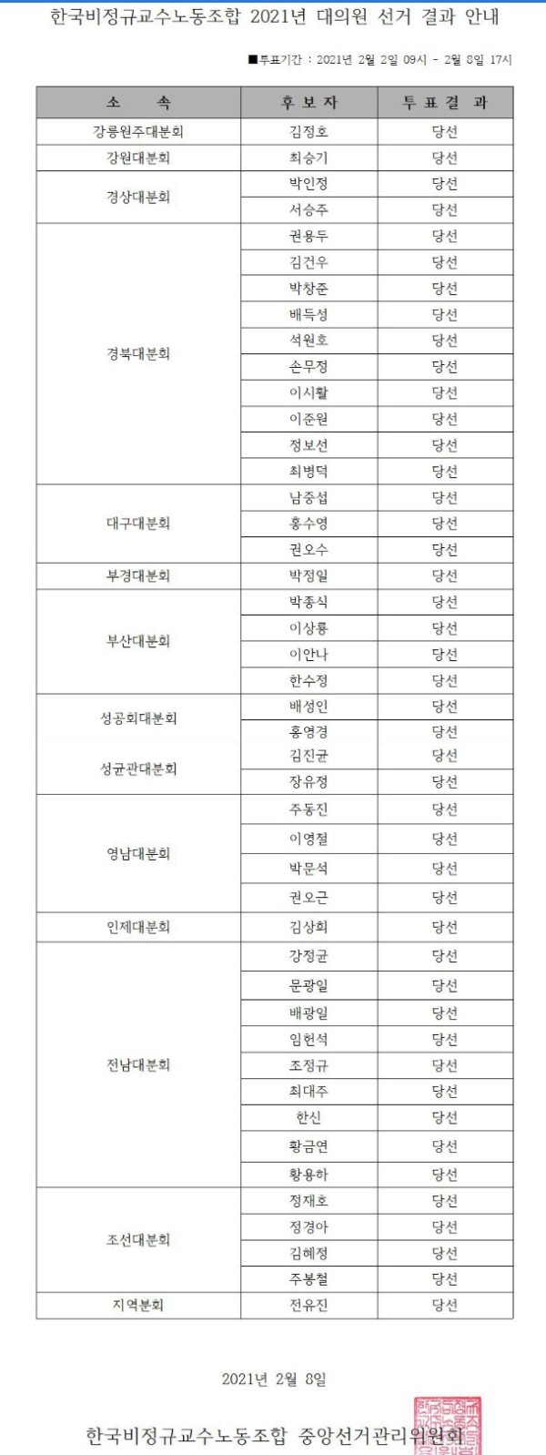 2021 한국비정규교수노동조합 대의의 선거 결과 페이지 정보 작성자 조선대분회 작성일21-02-10 23:11 조회411회 댓글0건 이전글 다음글 목록 본문 2021 한국비정규교수노동조합 대의의 선거 결과 댓글목록 등록된 댓글이 없습니다. 이전글 다음글 목록