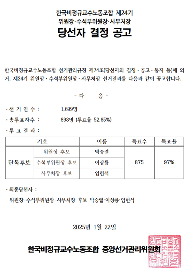 한국비정규교수노동조합 24기 임원(위원장, 수석부위원장, 사무처장)선거 당선자 결정 공고
