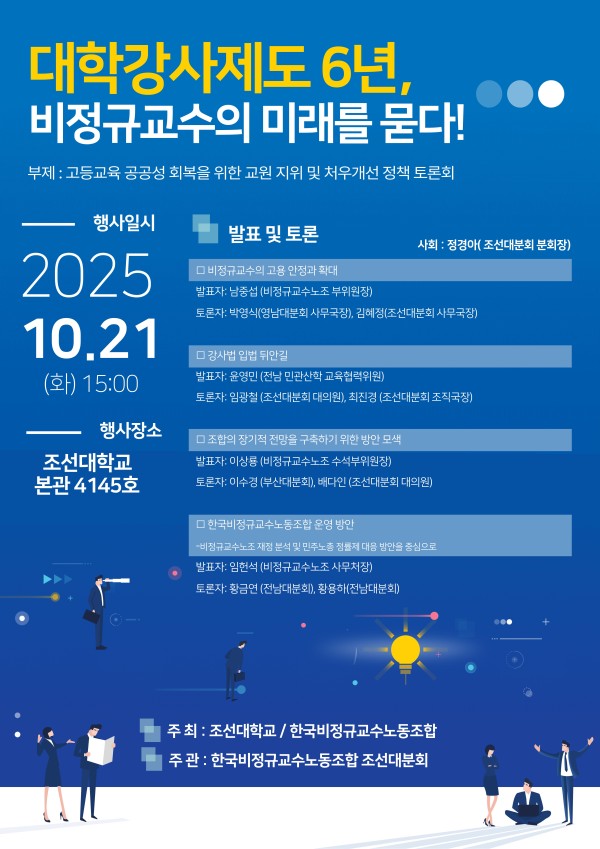 2025 비정규교수 미래정책 세미나 행사 안내 페이지 정보 작성자 조선대분회 작성일25-10-21 10:03 조회454회 댓글0건 이전글 다음글 목록 본문 조합원님들의 많은 참여 바랍니다. 댓글목록 등록된 댓글이 없습니다. 이전글 다음글 목록